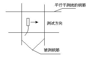 在钢筋的位置和保护层测试中,首先要进行测线的布置。确定被测受力钢筋的排列方向(走向),然后 垂直受力钢筋的走向布置一条测线,沿测线对受力钢筋进行连续扫描,确定钢筋的位置和保护层厚度,每条测线上扫描不少于6 根受力钢筋(梁底面受力钢筋要全部扫描)。当有平行于测线的钢筋分布时,为了避开钢筋影响,提高测试精度,要先用钢筋仪扫描出这些钢筋的位置,然后在相邻的两根钢筋间布置测线。测线布置简图如图1。
